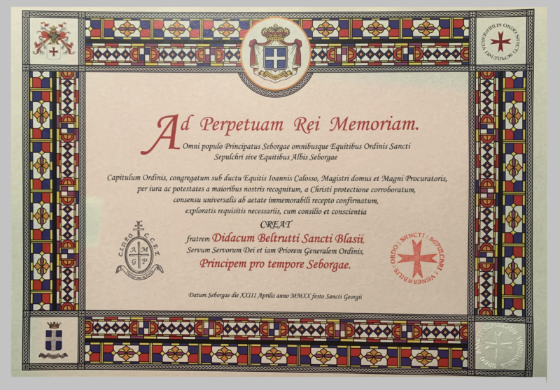 Il 23 aprile 2020 il Capitolo dell’Ordine dei Cavalieri Bianchi, si è riunito per la nomina del Principe dopo la morte del Principe Giorgio carbone. L’Ordine è l’unica aggregazione che a Seborga mantiene e porta avanti la tradizione cavalleresca. Sotto la guida del Maestro di Casa e Gran Procuratore, Giovanni Calosso, il Capitolo nomina Principe di Seborga pro tempore il Cav. Diego Beltrutti di San Biagio. Diego Beltrutti di San Biagio ricopriva già la carica di Priore Generale del Venerabilis Ordo Sancti Sepulchri, ordine cavalleresco i cui membri sono anche noti come i Cavalieri Bianchi di Seborga.