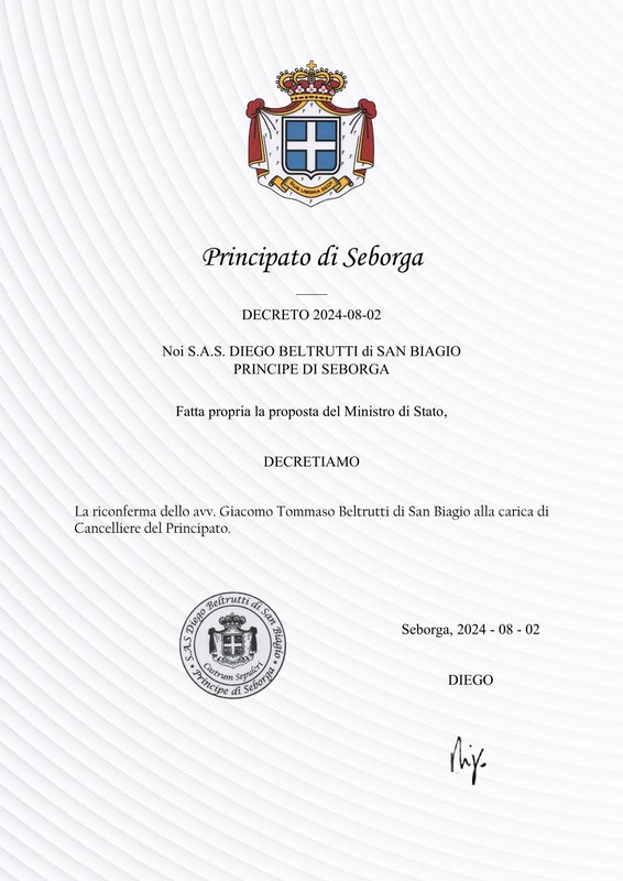 Allo scadere del precedente mandato il Principe ha riaffidato l’ufficio di Cancelleria allo avv. Giacomo Tommaso Beltrutti di San Biagio.