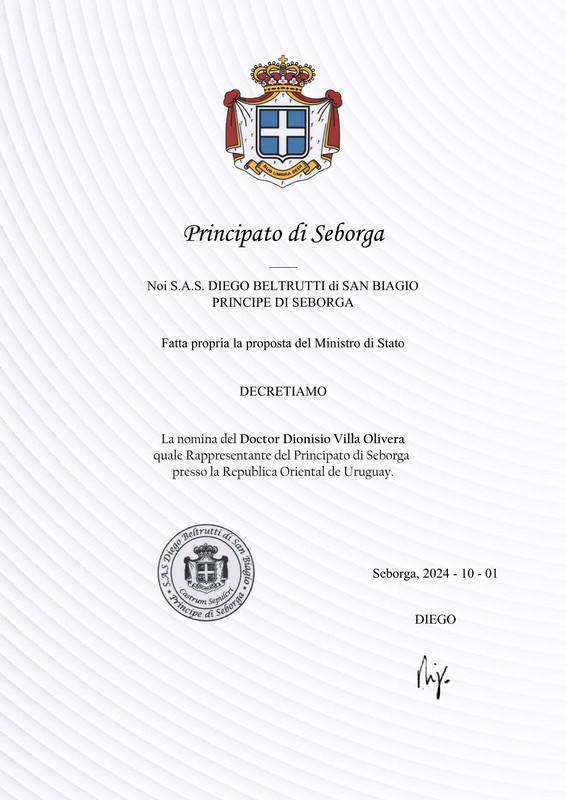 Con Decreto 2024-10-01 il doctor Dionisio Villa Olivera di Montevideo è stato nominato Rappresentante Diplomatico presso la Repubblica Oriental de Uruguay.